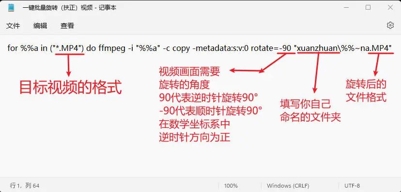 for %%a in ("*.MP4") do ffmpeg -i "%%a" -c copy -metadata:s:v:0 rotate=-90 "xuanzhuan\%%~na.MP4"