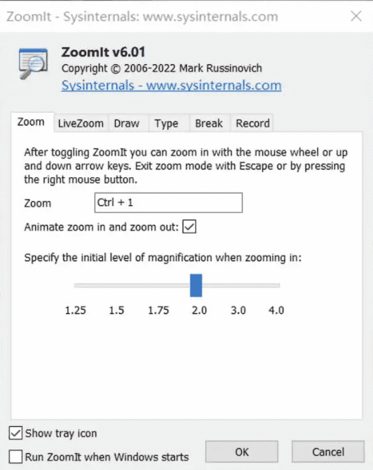 1、软件介绍ZoomIt 的主要功能包括 屏幕放大,屏幕注释,倒计时。其使用简单到底,运行后驻留系统托盘,没有任何界面。2、常用快捷键ALT+1 局部放大ALT+2 屏幕画笔ALT+3 倒计时3、下载地址:下载地址1(官网) 下载地址2(123盘) 最后修改:2023 年 03 月 20 日 © 允许规范转载 打赏 赞赏作者 支付宝微信 赞 如果觉得我的文章对你有用,请随意赞赏