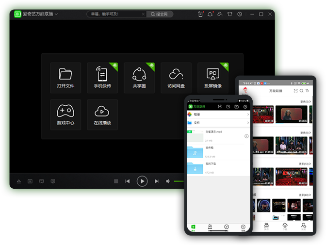 万能联播,是一款爱奇艺出品的万能播放和快传工具。支持多种音视频格式播放,支持不限地域、不受本地WiFi网络限制的云投屏,支持在手机及电脑间跨平台设备间高速互传。
