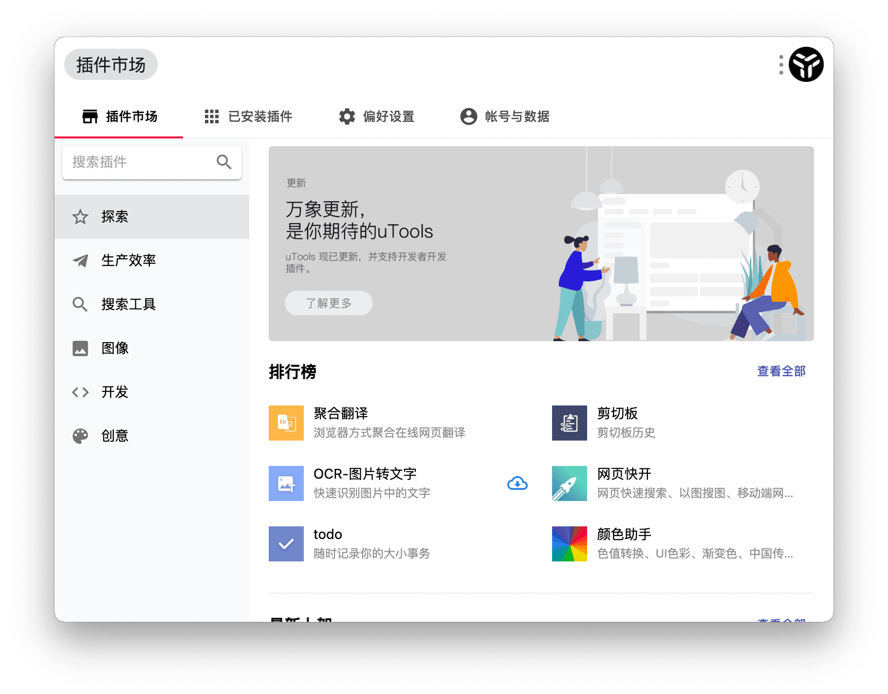 1、软件介绍uTools = your tools(你的工具集)uTools 是一个极简、插件化的现代桌面软件,通过自由选配丰富的插件,打造得心应手的工具集合。通过快捷键(默认 alt + space )就可以快速呼出这个搜索框。你可以往输入框内粘贴文本、图片、截图、文件、文件夹等等,能够处理此内容的插件也早已准备就绪,统一的设计风格和操作方式,助你高效的得到结果。一旦你熟悉它后,能够为你节约大量时间,即用即走、不中断、无干扰,让你可以更加专注地改变世界。2、下载地址下载地址1(官网) 下载地址2(123盘) 最后修改:2023 年 03 月 08 日 © 允许规范转载 打赏 赞赏作者 支付宝微信 赞 如果觉得我的文章对你有用,请随意赞赏